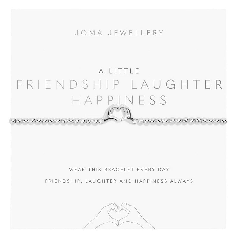 This A Little silver-plated 'Friendship Laughter Happiness' Bracelet features a captivating stretch design and a heart-shaped hands charm. This piece is sure to make a standout gift and a wonderful addition to your loved one's collection.
