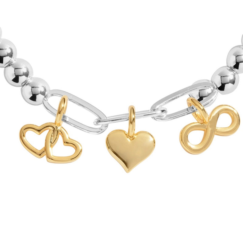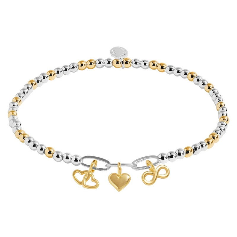 Add a spark of charm to your look with the Infinity Heart Charms Bracelet! This playful stretch bracelet blends silver and gold-plated beads with three dazzling gold-plated charms: an infinity symbol, a heart, and interlocking hearts.