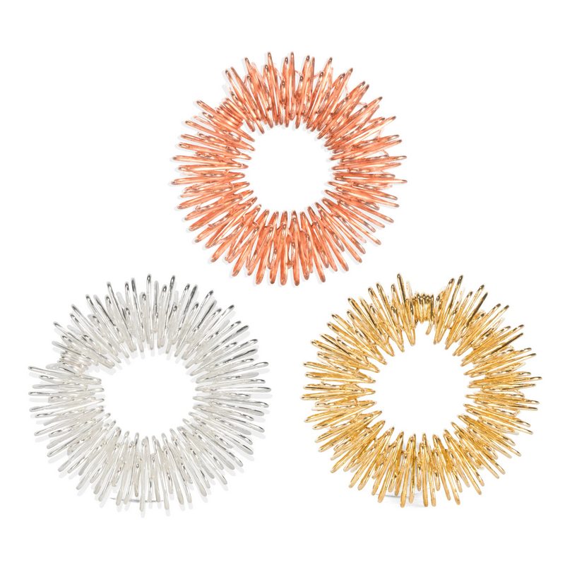 Experience renewed energy with the Acupressure Massage Rings. This set of 3 flexible rings, equipped with triangular points, gently stimulate and massage tired fingers to boost circulation and enhance focus.