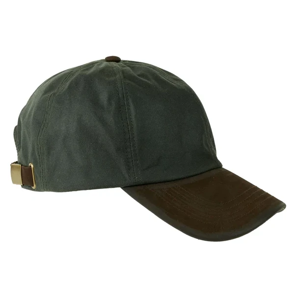 The Hamilton Baseball Cap offers a classic look with a deep olive green wax cotton crown and a brown leather peak for contrast.