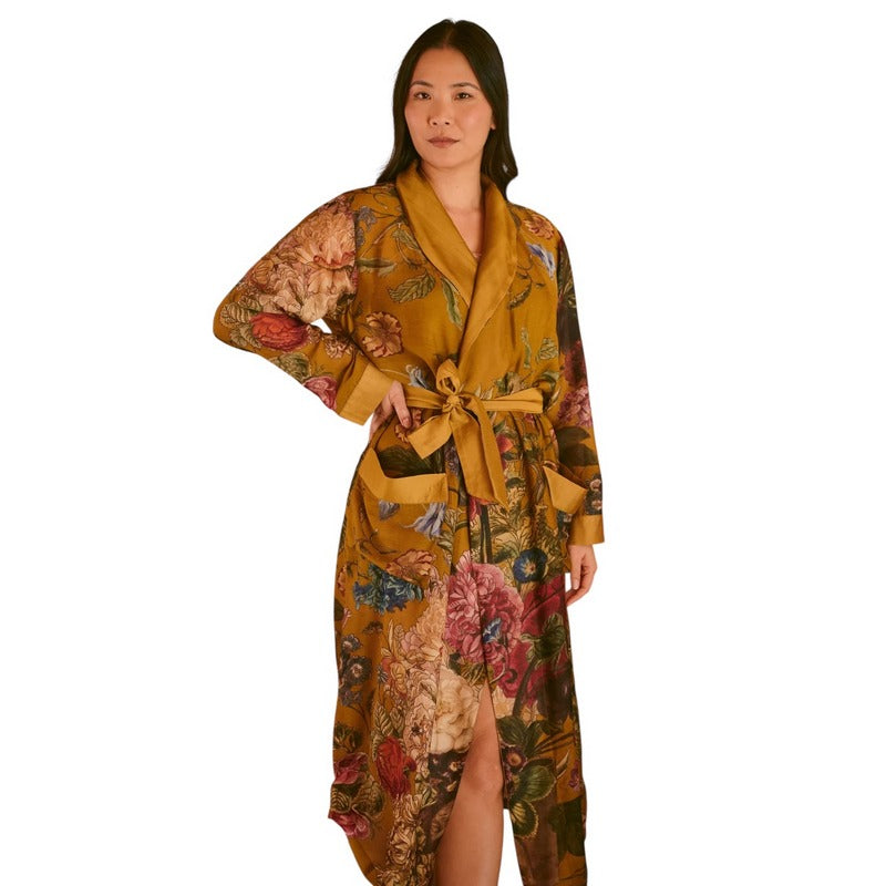 Step into a masterpiece with One Hundred Stars' Primula Dressing Gown in gold—a wearable tribute to the Dutch Old Masters. This stunning gown bursts with intricately detailed primroses, auriculas, and polyanthus blooms in a glorious palette of bold, jewel-toned hues that'll make you feel like walking art.