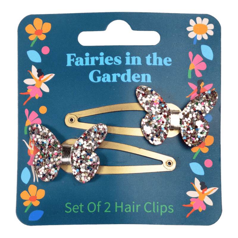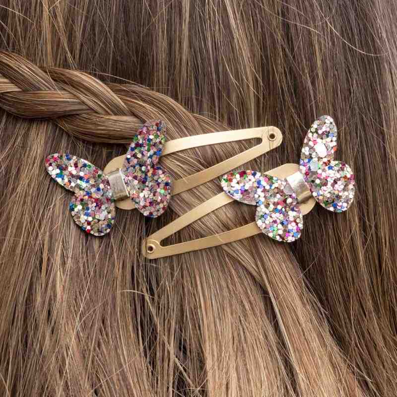 Enhance any hairstyle with this pair of gold Fairies in the Garden hair clips. These shimmering butterfly clips bring a touch of magic, perfect for toddlers and tweens looking to add sparkle to their look.