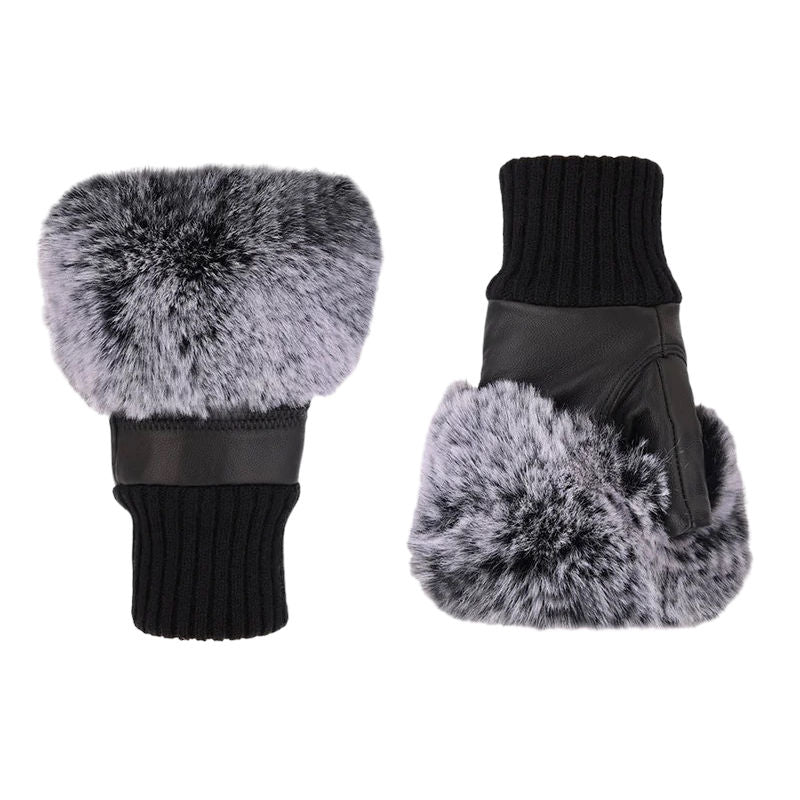 Stylish fingerless black leather gloves with ribbed cuffs and a grey faux fur trim.