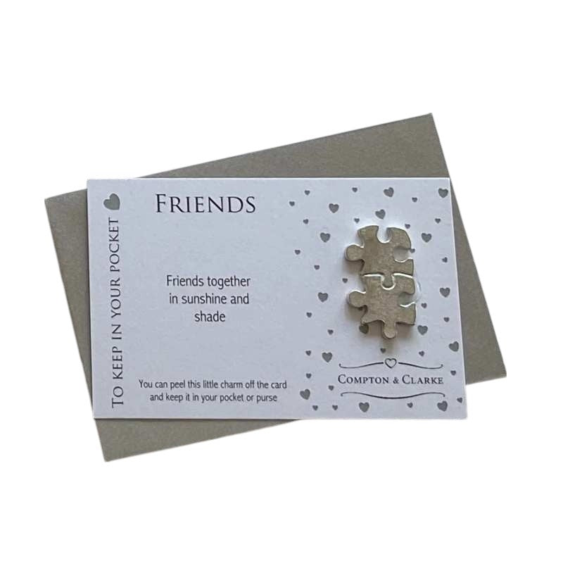 This charming piece features two pewter jigsaw pieces joined together, displayed on a shimmering pearlescent card sprinkled with tiny hearts. The card reads: "Friends together in sunshine and shade."