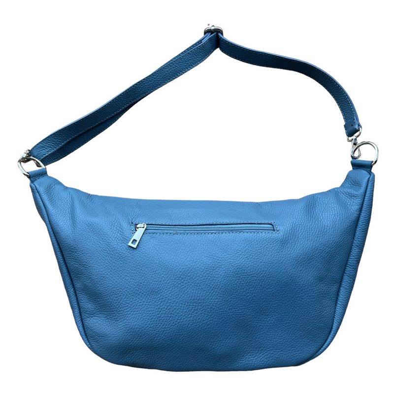 Effortlessly stylish and versatile, the Italian Leather Large Crescent Handbag in Denim Blue is a must-have accessory. This soft leather bag features ample storage with two front zip pockets, one back zip pocket, and an internal zip pocket.