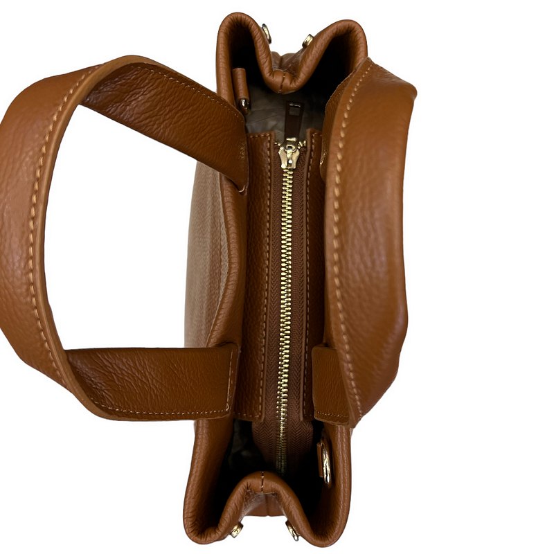 The adorable Italian Leather Mini Tote Bag in Dark Tan is perfect for any occasion. Its sleek design features no distracting zips, logos, or tassels on front or back. The secure zip closure on the inside is complemented by a slip and a zip pocket for organization.