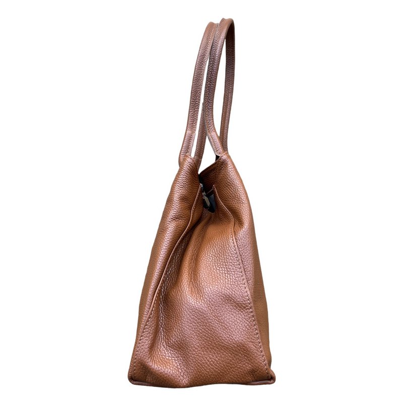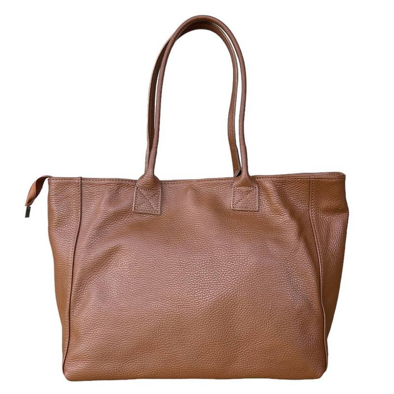 Introducing our Italian Leather Expandable Tote Bag! Perfect for unleashing your inner fashionista, this bag features luxurious dark tan leather and a stylish shape. Want more space? Just un-pop the inner strap for a surprisingly roomy compartment. Plus, enjoy the convenience of a zip top and fully lined interior with slip and zip pockets.