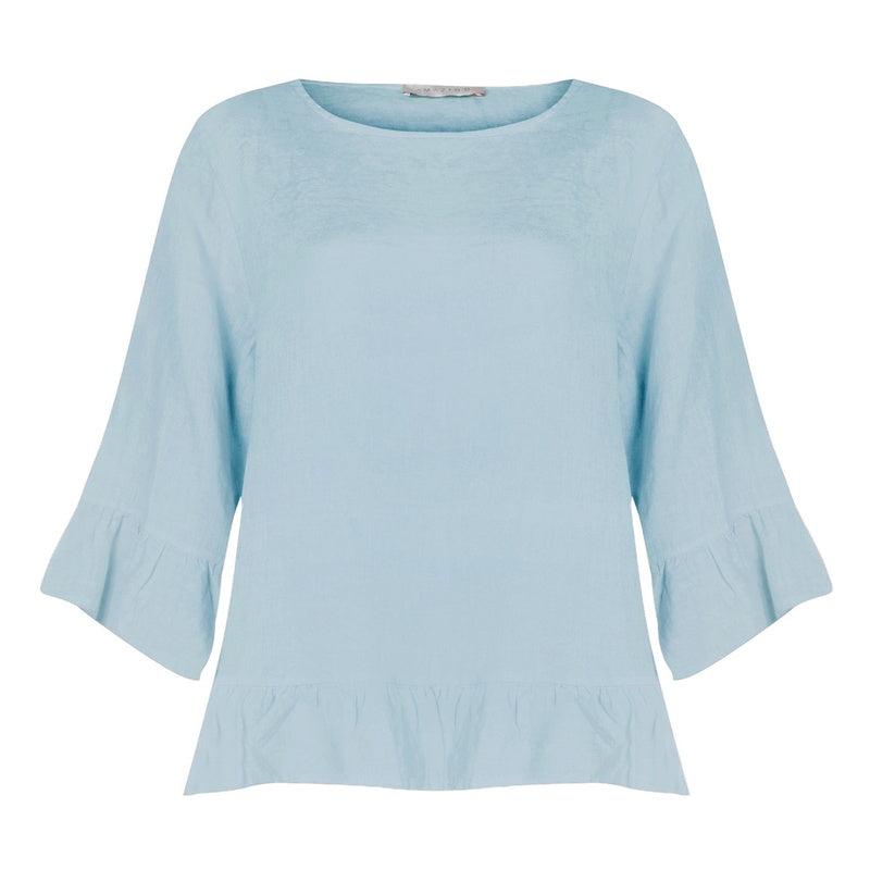 Made in Italy, this one-size linen top boasts an easy fit and charming features - a round neckline, bracelet-length sleeves, and frill hems in a lovely ice blue colour.