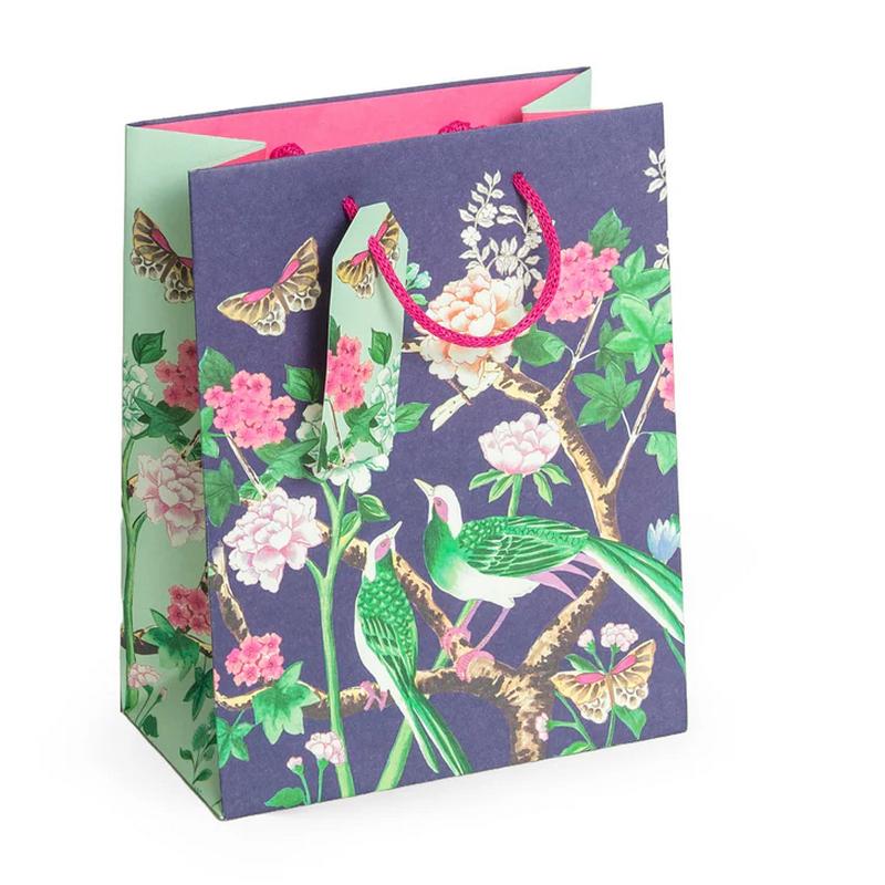 Show your appreciation by presenting your gift in the elegant Chinoiserie Purple Medium Portrait Gift Bag. Decorated with vibrant flowers and birds, it features pink paper handles and a die-cut tag.