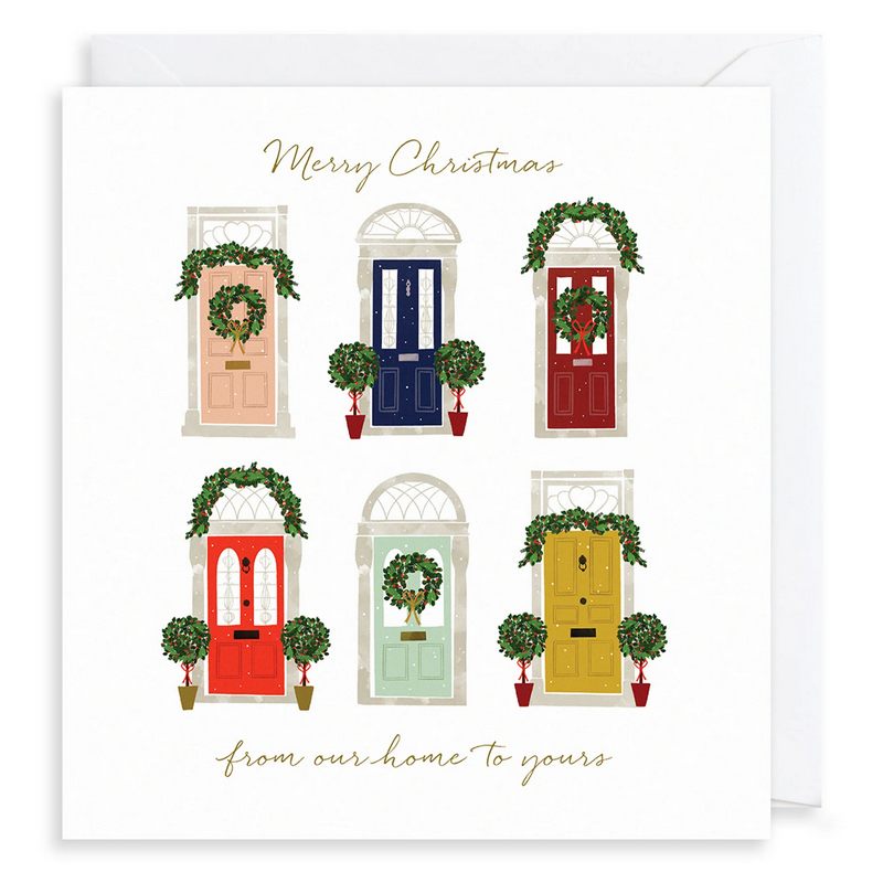 Send festive cheer with this gorgeous card! Six doors adorned in Christmas decorations adorn the cover, accompanied by a message of joy: "Merry Christmas, from our home to yours!" Spread some seasonal magic and delight your family and friends.