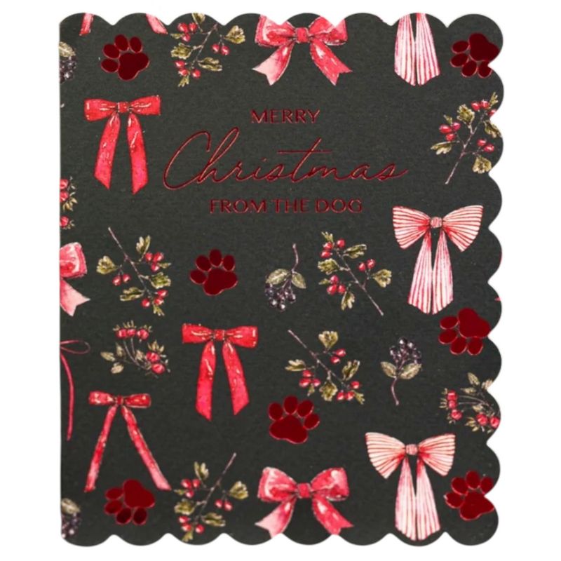 Let your furry friend deliver the holiday greetings with this delightful card from Toasted Crumpet Designs. Adorned with crimson bows and playful pawprints, the metallic red foil text announces "Merry Christmas From The Dog" in style.