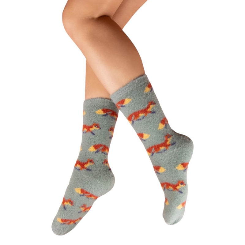 eet your new cosy companion - fuzzy socks that prove winter wear doesn't have to be boring. Adorned with adorable mini foxes prancing across an icy blue backdrop, these socks bring a dash of woodland whimsy to your feet.