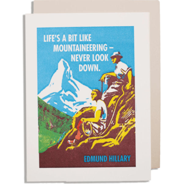 A vintage picture of climbers with the quote from Edmund Hilary "Life's Like Mountaineering - Never Look Down".
