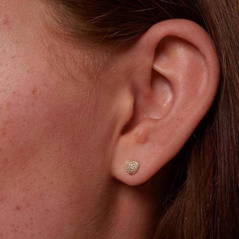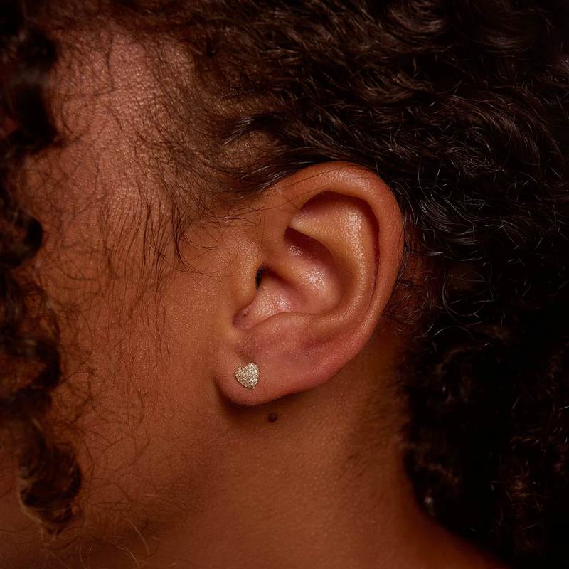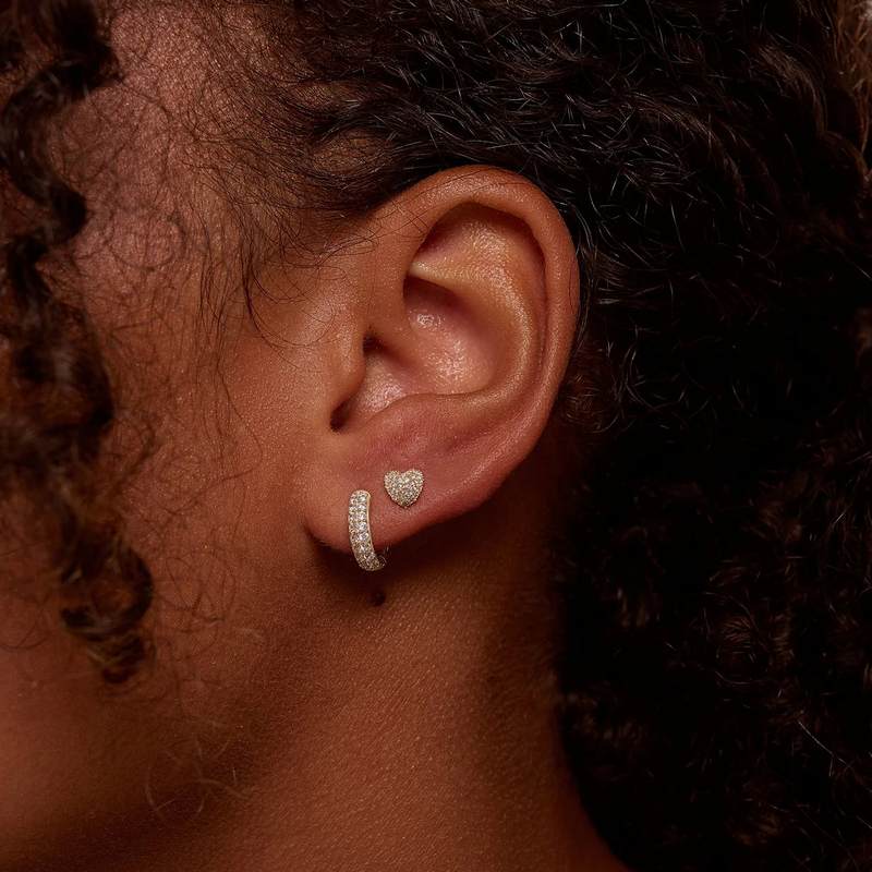 These gold-plated Pavé Heart Stud Earrings feature sparkling pavé cubic zirconia stones. Perfect for wearing solo or layering with other pieces. Each pair is carefully handcrafted from recycled and traceable materials, supporting sustainable and mindful fashion choices.