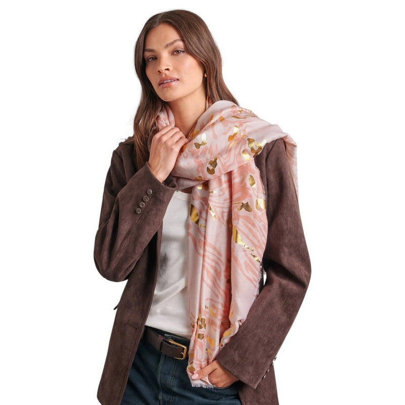 Discover effortless elegance with this Printed Foil Scarf from Katie Loxton, featuring a captivating Animal print in Dusty Pink with shimmering Gold foil accents.