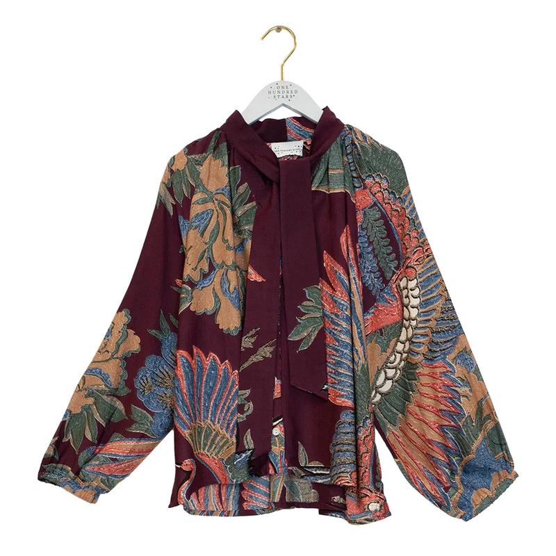 Celebrate good fortune and longevity with our playful Pussy Bow Blouse featuring graceful cranes in coral, blue, and jade green soaring across a rich plum backdrop. Crafted from a soft modal-cupro blend, this blouse offers comfort with a touch of elegance - bracelet sleeves, gathered neckline, and mother-of-pearl buttons create effortless style.