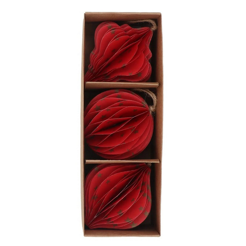 Bring festive sparkle to your tree with this charming set of three paper honeycomb decorations from Gisela Graham. Each unique shape showcases vibrant red paper adorned with delicate matt gold stars that catch the light beautifully.