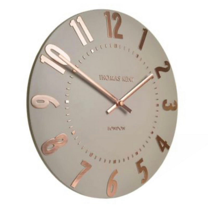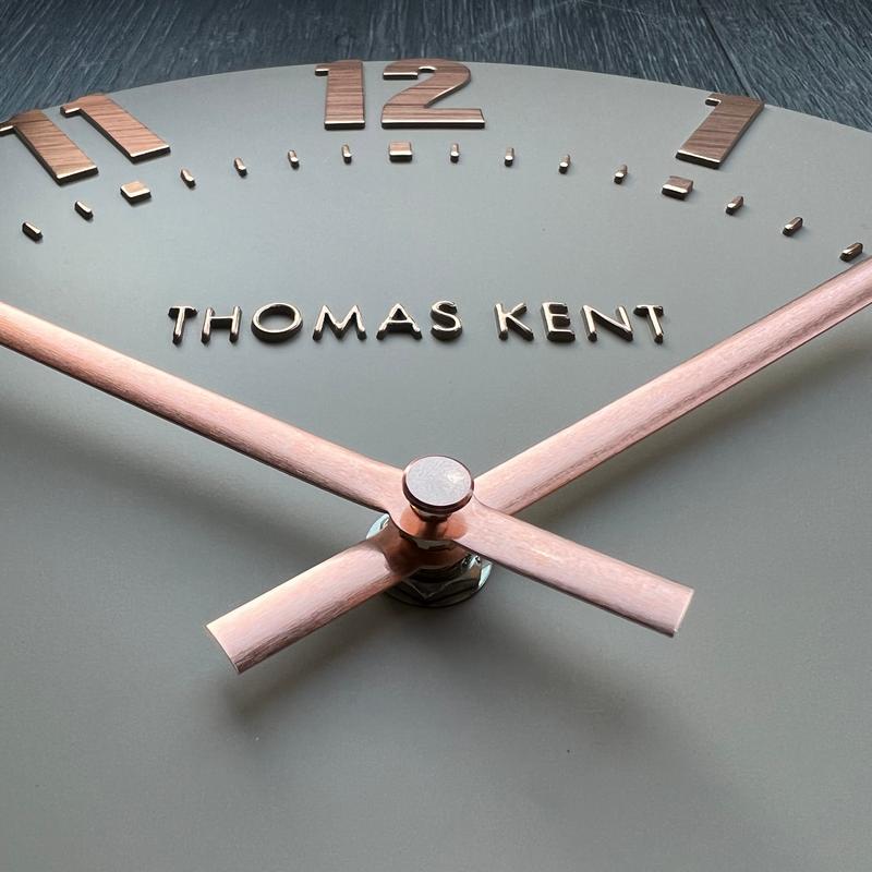 A gorgeous sleek modern wall clock with a gently curved face and raised rose-gold numerals and hands.