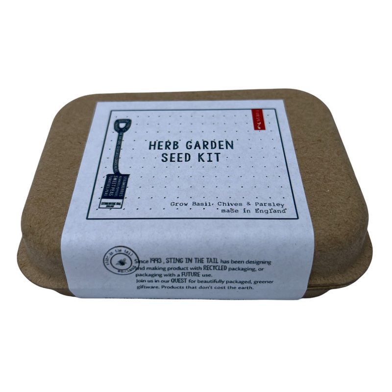 Herb Garden seeds, compressed coir compost, and labels. The box can be used as a seed tray to grow the Basil, Chives and Parsley included.