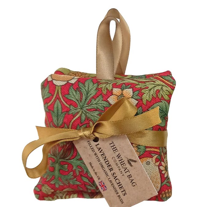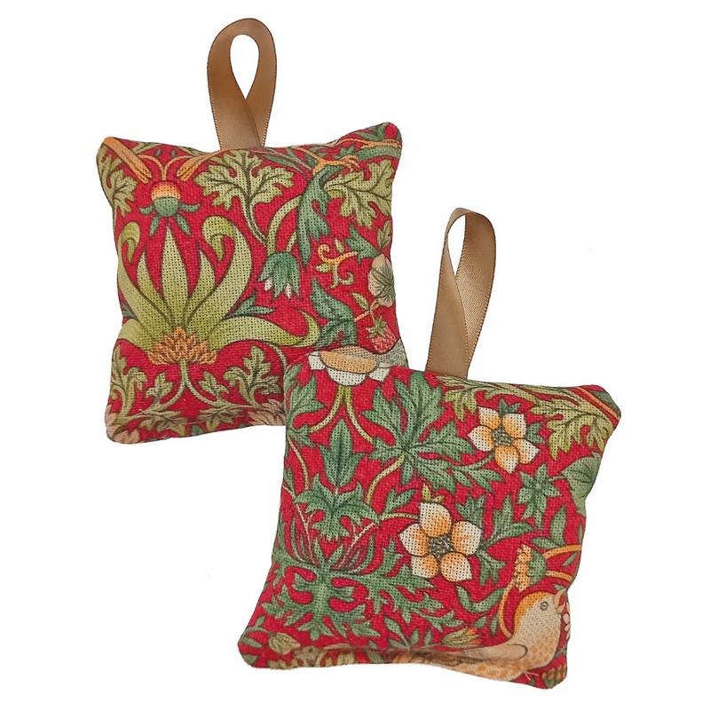 Add some whimsical charm to your wardrobe or bedside with this set of 2 Lavender Sachets! These handmade cotton sachets are filled with lavender buds and feature William Morris' "Strawberry Thief" design on a crimson background.