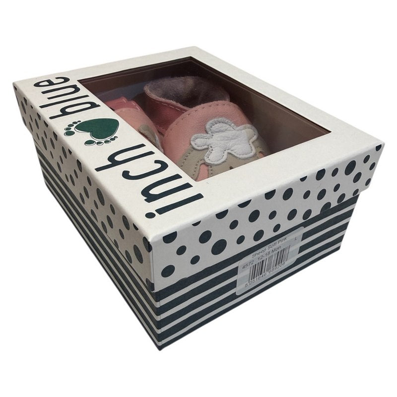 Adorable soft pink booties featuring a charming appliqued sheep with a flower tucked in its mouth—perfect for baby showers! Crafted from supple real leather, these little shoes allow natural foot development.