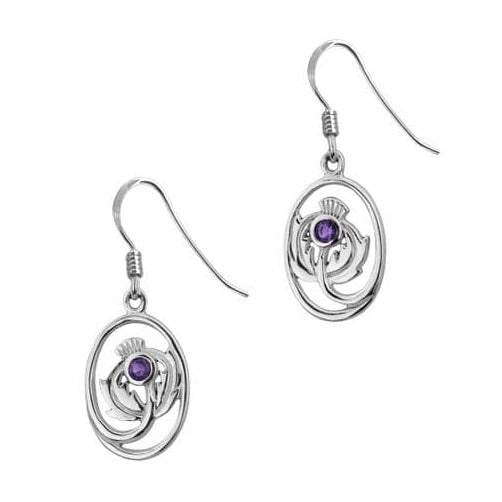 Discover the magic of Scottish tradition with these enchanting Sterling Silver Drop Earrings. Each earring features a beautifully stylised thistle nestled within an elegant oval frame, crowned with a mesmerising amethyst-coloured stone.