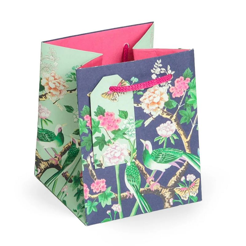 Surprise a loved one by presenting your gift in the beautiful Chinoiserie Purple Small Gift Bag. Adorned with vibrant flowers and birds, it includes pink paper handles and a die-cut tag for a charming finish.