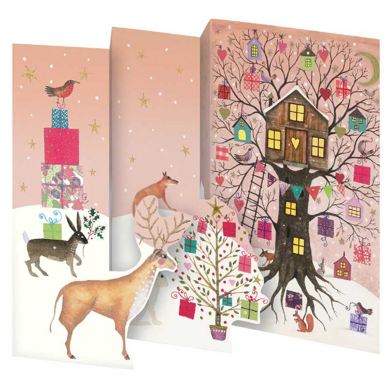 A pack of 5 Christmas note cards with the lovely Treehouse design by Jane Ray. The trifold cards have die-cut Pop Out features to give a 3D effect.