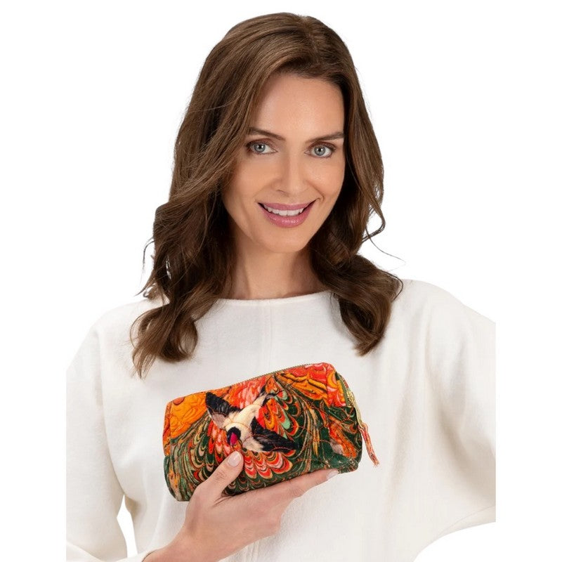 Wrap yourself in seasonal elegance with this stunning Quilted Velvet Vanity Bag from Powder Designs. Featuring a mesmerising marbled orange and green palette adorned with a graceful flying swallow, it's the ultimate cold-weather luxury accessory.