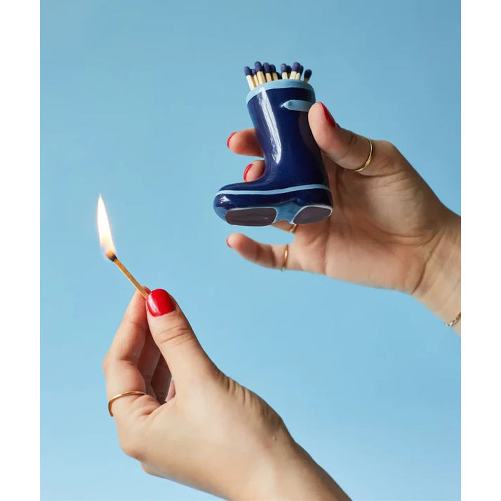 Strike a match and add a splash of countryside charm to your home with this delightful Wellington boot match holder. Crafted from sturdy ceramic in classic navy blue, it arrives pre-loaded with 25 safety matches ready to ignite cosy evenings by the fire.