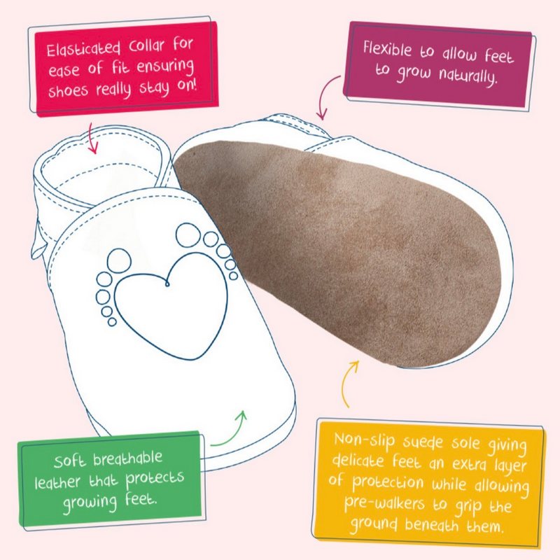 With a suede sole for gentle grip and easy maintenance with just a damp cloth, these UK-made booties are perfect for indoor adventures.