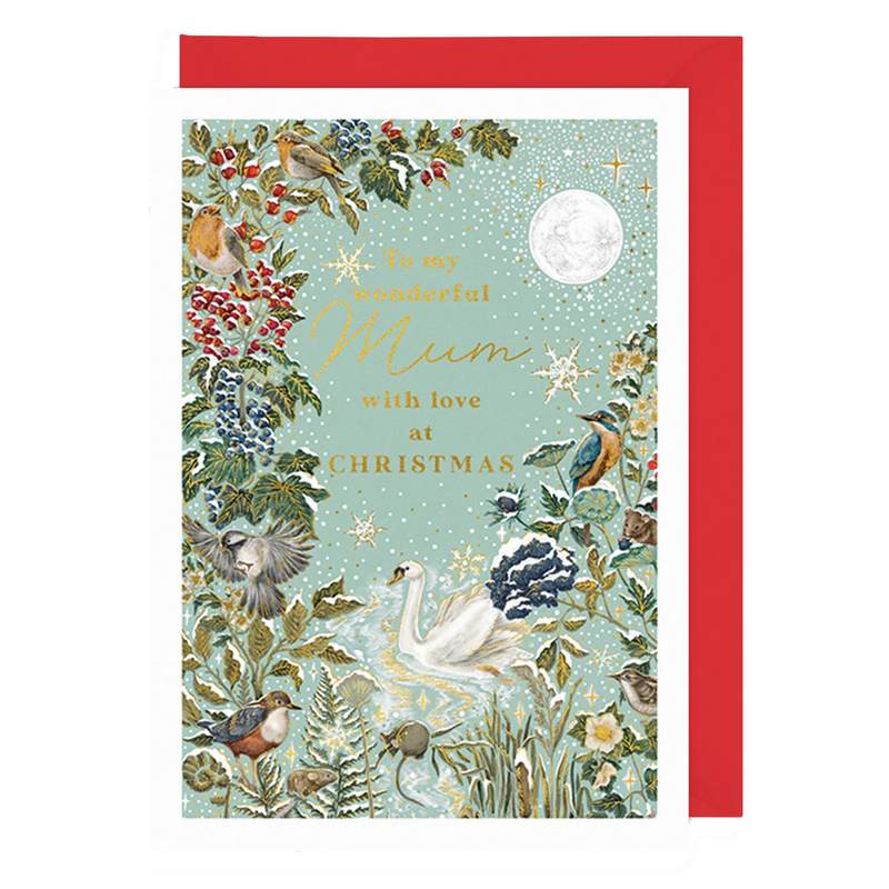 Spread a little Christmas cheer to your mum with this beautiful card! Featuring a peaceful winter scene with a swan and other wildlife, this card is the perfect way to show your mum you care. With the sweet sentiment "To my wonderful mum, with love at Christmas," it's a thoughtful way to show your love. Make your mum's holiday season a little brighter!